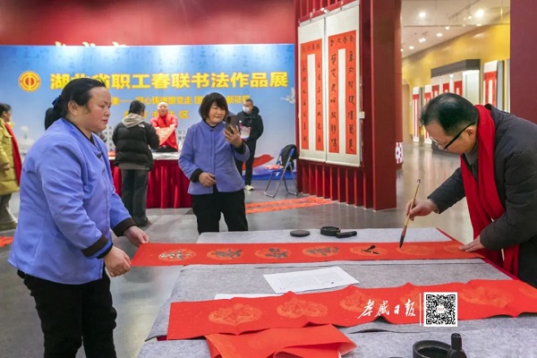 “党绘宏图荆楚秀湖北逐梦岁月新,横批‘筑梦前行’”“楚乡开放惠千家鄂地革新兴百业,横批‘荆楚焕新’”活动现场一副副饱含祝福的春联挂满展厅营造出浓浓年味儿。