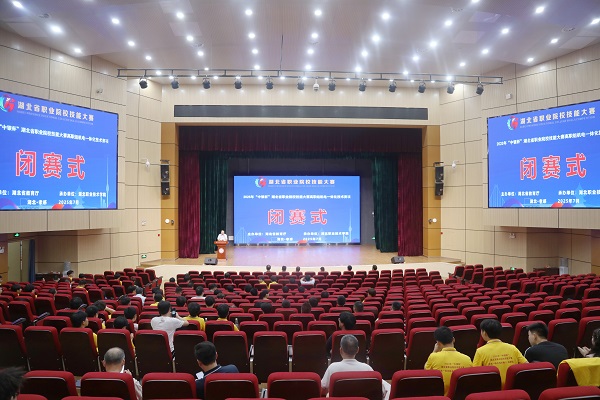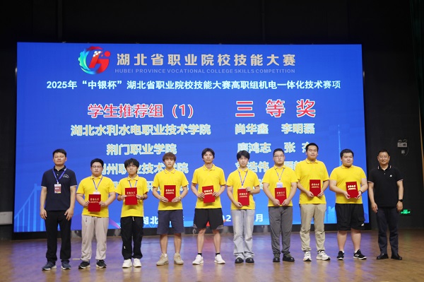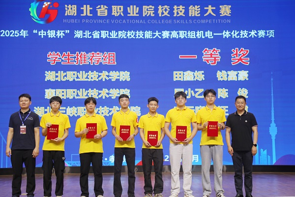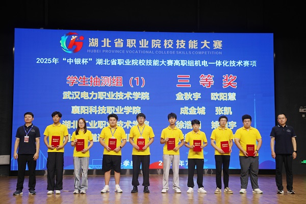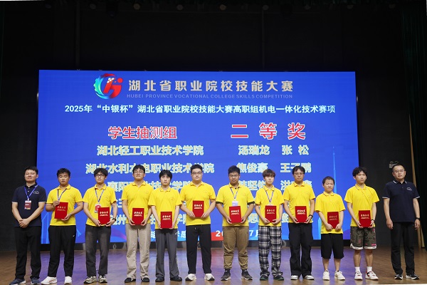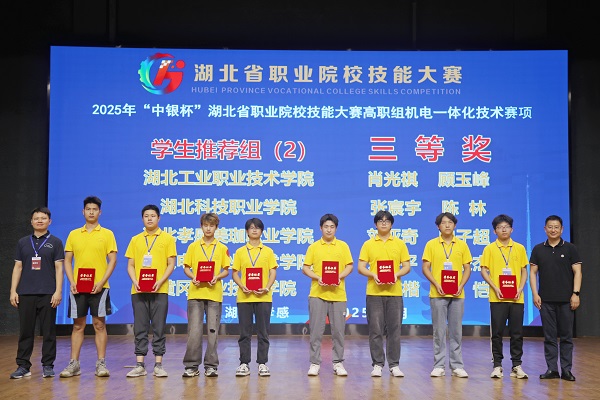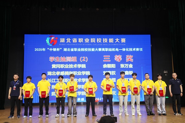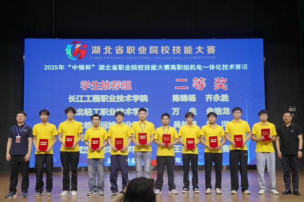 (本网讯 胡明亮 黄文军 陈灏 唐熙隆)7月4日,2025年“中银杯”湖北省职业院校技能大赛高职组机电一体化技术赛项颁奖典礼暨闭幕式在我校南校区崇德礼堂举行。经过为期三天的激烈角逐,来自全省34所高职院校的68支代表队、136名选手展现了精湛的技能水平,赛项圆满落下帷幕。裁判长黄华、监督长于洪永、我校校长郭沙等出席闭幕式并为获奖选手颁奖。副校长胡昌杰主持颁奖典礼暨闭幕式。