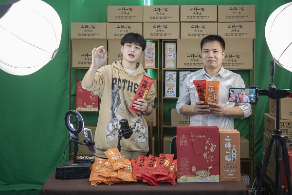 (本网讯 轩传)8月9日,孝感市大悟山区,熊文文在线上直播销售大别山全域农副产品,这个集产品分拣打包、直播培训、现场直播于一体的电商直播基地,一片繁忙。