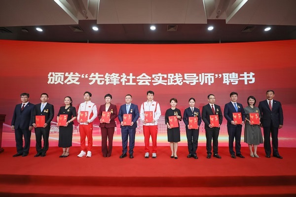 (中国人民大学党委书记张东刚、校长林尚立为杨晶等颁发“中国人民大学先锋社会实践导师”证书)