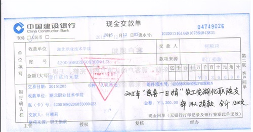 2015年10月16日,学校工会根据市政府“慈善一日捐”通知精神,以“伸援手,救急难”为主题,以“慈心为民、善举济世、以人为本、为民解困”为宗旨,组织全体工会会员献爱心,共收到教职工595人捐款44680元。另收到农工党湖北职院支部14人捐款1200元。总计捐款人数为609人,捐款金额45880元。根据财经纪律,工会将所有捐款存入学校账户监管。上述捐款上缴10000元孝感市慈善总会,余下捐款学校将分步骤、分阶段用于精准扶贫点。