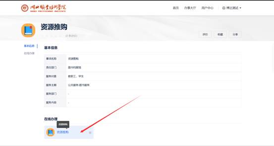 2. 在左侧【公共服务】栏目→选择图书服务下的 【资源推购】 进入资源推购页面。