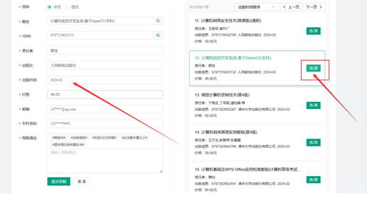 在题名中输入要荐购的书名,点击检索框。右侧显示图书信息,点击对应的图书,自动同步书目信息到表单中。