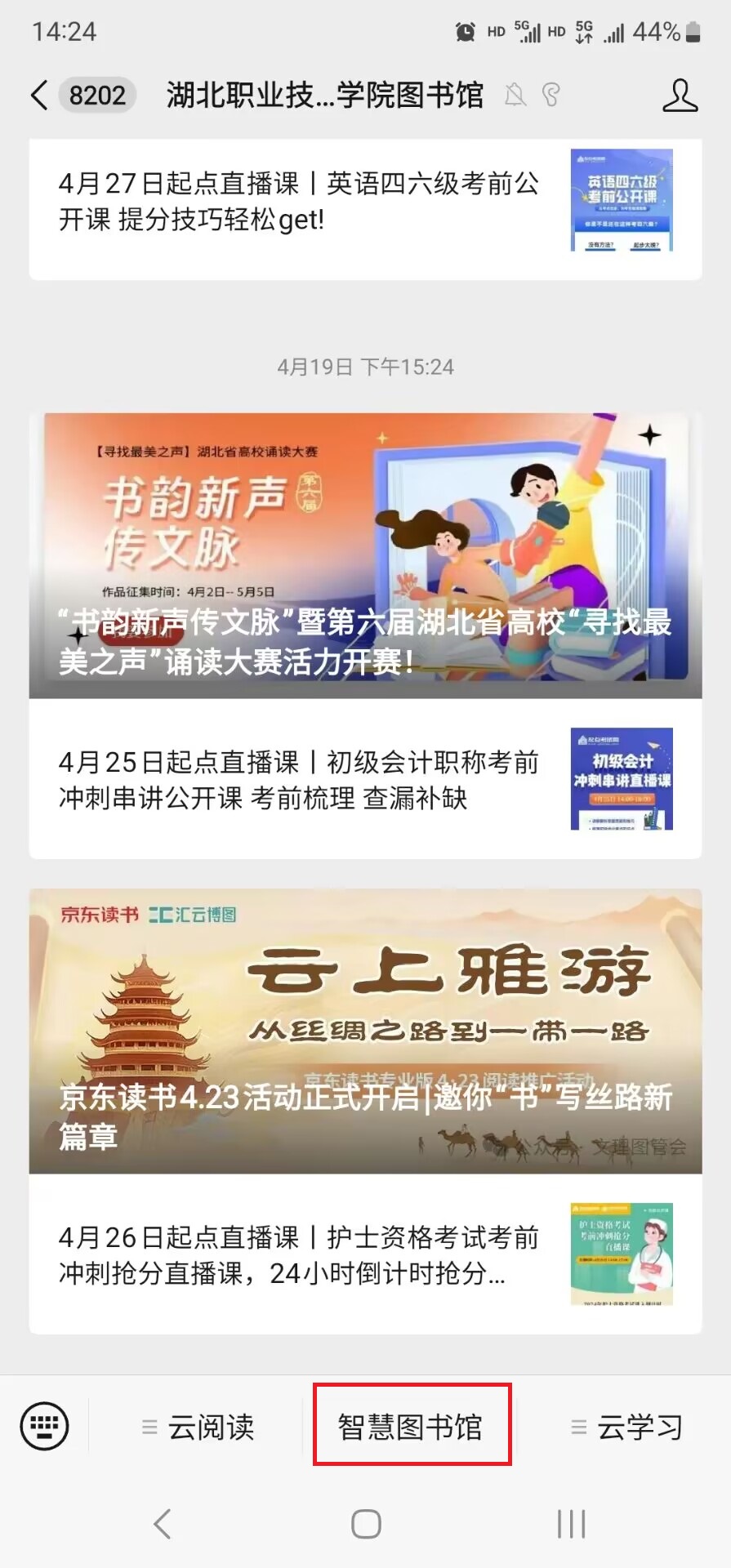 (2)打开【智慧图书馆】栏目→【帐号绑定】绑定学号、工号→【资源荐购】进入应用