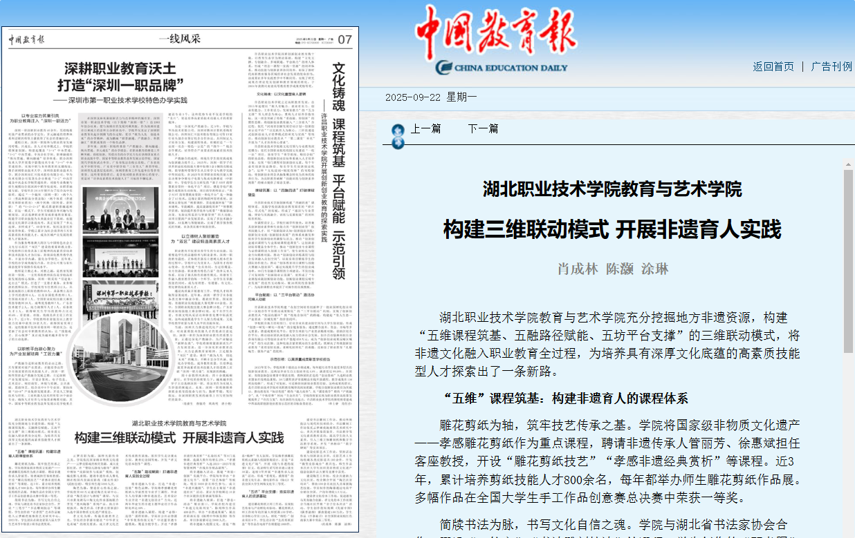 雕花剪纸为轴,筑牢技艺传承之基。学院将国家级非物质文化遗产——孝感雕花剪纸作为重点课程,聘请非遗传承人管丽芳、徐惠斌担任客座教授,开设“雕花剪纸技艺”“孝感非遗经典赏析”等课程。近3年,累计培养剪纸技能人才800余名,每年都举办师生雕花剪纸作品展。多幅作品在全国大学生手工作品创意赛总决赛中荣获一等奖。