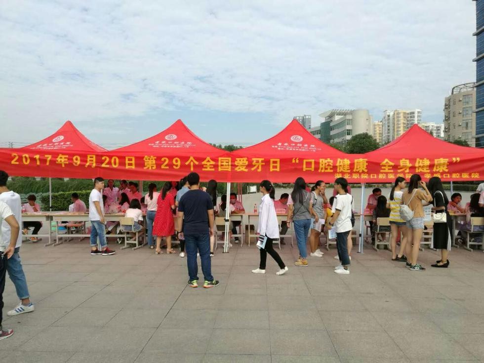 9月20日是第29个全国爱牙日,为弘扬师生奉献精神,进一步提高师生专业实践能力,9月16日及9月20日,口腔医学院联合孝感口腔医院分别在学校东校区乐学楼广场、大润发广场主办了主题为“口腔健康,全身健康”的口腔疾病预防宣教与义诊活动。口腔医学院专业教师、孝感口腔医院专家、口腔医学院优秀学生代表等参加了相关活动。